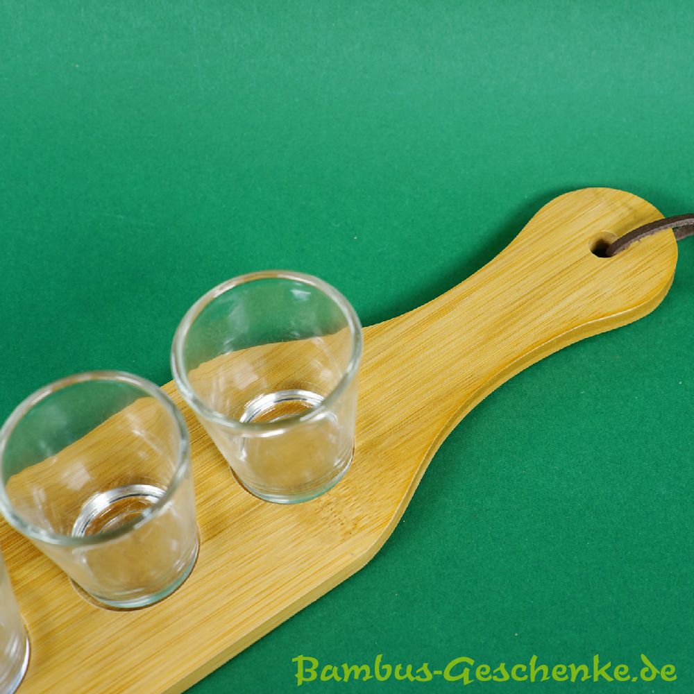 Bambus-Brett mit 4 Shot-Gläsern (je 6 cl), Vertiefungen im auf Bambus-Tablett geben den Shot-Gläsern einen sicheren Halt, mit Aufhängeband aus Leder, Größe: 33 x 8 cm, optional mit Gravur, in Geschenkverpackung