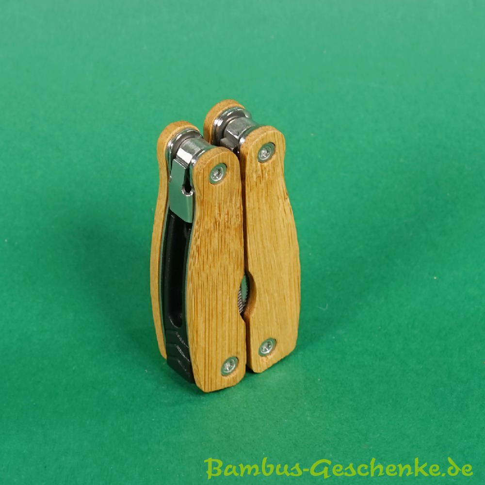 Multifunktionswerkzeug aus Edelstahl mit Bambusschalen und verschiedenen Werkzeugen wie Zange, Messer, Säge, Schraubendreher, Feile, etc., Größe: 7,2 x 3,5 x 1,8 cm, optional mit Gravur, in Geschenkverpackung