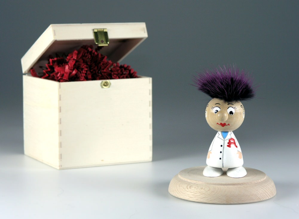 HolzHeinzel "Apothekerin" in-a-box, handbemalt, Sockel aus Buche-Massivholz, H: ca. 9,0 cm, in Holz-Geschenkbox (10,0 x 10,0 x 10,0 cm), Gravur-Empfehlung: auf Verpackungsaußenseite / auf Holzsockel, Ausfall Haarfarbe von weiß bis schwarz immer unterschiedlich