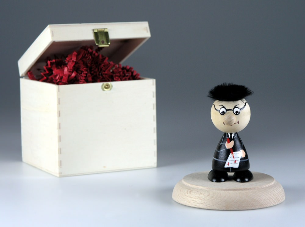 HolzHeinzel "Lehrer" in-a-box, handbemalt, Sockel aus Buche-Massivholz, H: ca. 9,0 cm, in Holz-Geschenkbox (10,0 x 10,0 x 10,0 cm), Gravur-Empfehlung: auf Verpackungsaußenseite / auf Holzsockel