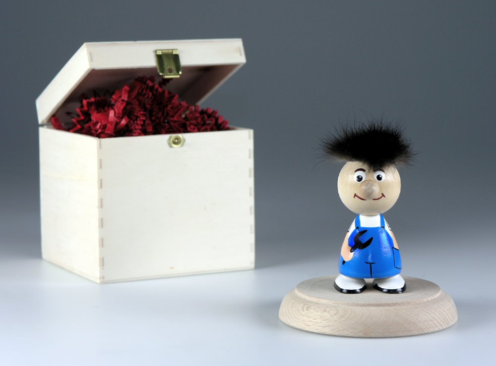 HolzHeinzel "Mechaniker" in-a-box, handbemalt, Sockel aus Buche-Massivholz, H: ca. 9,0 cm, in Holz-Geschenkbox (10,0 x 10,0 x 10,0 cm), Gravur-Empfehlung: auf Verpackungsaußenseite / auf Holzsockel