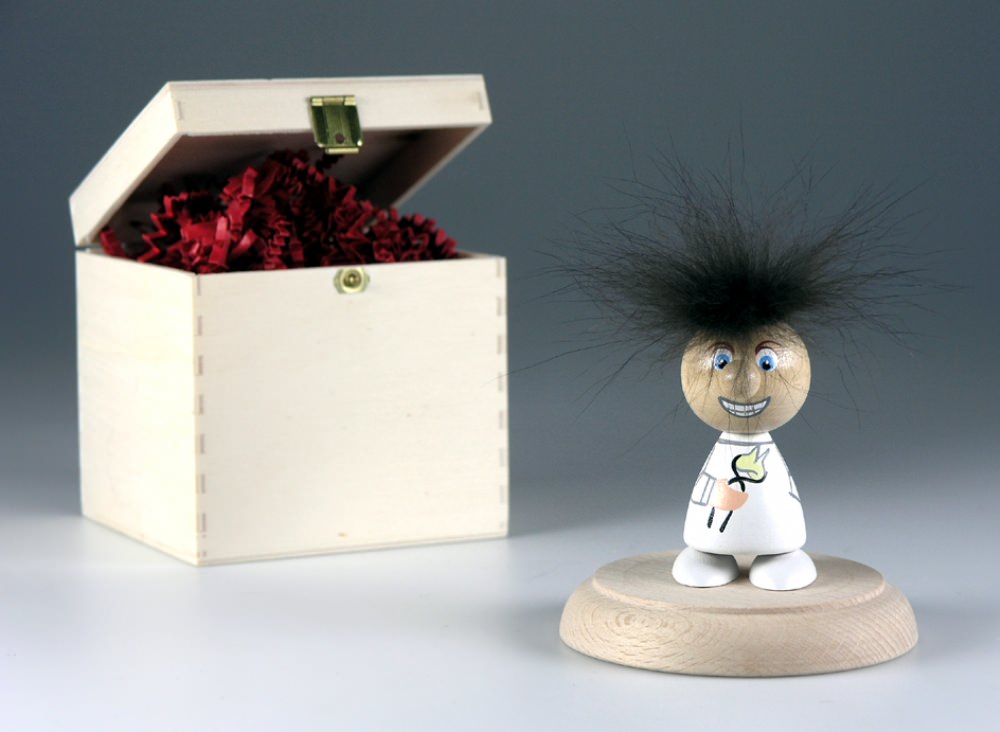 HolzHeinzel "Zahnarzt" in-a-box, handbemalt, Sockel aus Buche-Massivholz, H: ca. 9,0 cm, in Holz-Geschenkbox (10,0 x 10,0 x 10,0 cm), Gravur-Empfehlung: auf Verpackungsaußenseite / auf Holzsockel, Ausfall Haarfarbe von weiß bis schwarz immer unterschiedlich